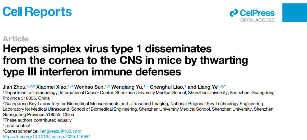 近日,草莓视频 卡尔森国际肿瘤中心、基础医学院叶亮副教授团队在国际知名学术期刊Cell Reports在线发表了题为“Herpes simplex virus type 1 disseminates from the cornea to the CNS in mice by thwarting type III interferon immune defenses”的研究论文。该研究发现I型单纯疱疹病毒(HSV-1)通过抑制角膜III型干扰素(IFN-λ)免疫防御入侵中枢神经系统的新机制,为预防和治疗HSV-1引起的脑部感染提供了新的理论依据和潜在治疗方向。草莓视频 博士后周建、硕士生肖晓梅、孙文豪、本科生余文强为论文共同第一作者,草莓视频 叶亮副教授为本文独立通讯作者,草莓视频 为第一完成单位。