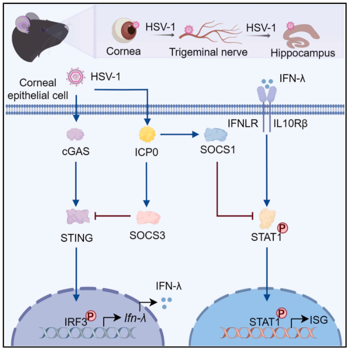I型单纯疱疹病毒(HSV-1)是一种广泛存在的病毒,常引起口腔疱疹,也可通过眼睛角膜感染潜入三叉神经并最终扩散至大脑,引发疱疹性脑炎及其它中枢神经系统疾病。然而,HSV-1突破角膜天然免疫屏障传播至中枢神经系统的作用机制尚不清楚。研究团队发现,HSV-1利用其“间谍蛋白”ICP0,在角膜上皮细胞中激活了两个“破坏分子”细胞因子信号抑制因子1(SOCS1)和SOCS3。SOCS3负责摧毁天然免疫系统的“警报器”干扰素基因刺激因子(STING),从而阻断III型干扰素(IFN-λ)产生。SOCS1则干扰了IFN-λ抗病毒免疫信号的执行,使细胞无法建立防御状态。这两者联手为病毒打开了“绿色通道”,使其得以逃逸并在大脑中复制。重要的是,通过使用STING激动剂或直接补充IFN-λ,可以重新激活角膜的免疫防御,有效阻断病毒向大脑传播,为预防和治疗角膜病毒感染及病毒诱导的中枢神经系统疾病提供了新策略。
